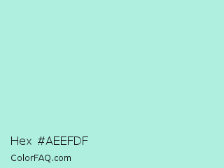 Hex #aeefdf Color is a very light cyan color and the nearest color is Cruise #b5ecdf. Hex code #aeefdf and RGB value is rgb(174,239,223). In RGB color space, this color is composed of 68% red, 94% green, 87% blue, In CMYK color space, this color is composed of 27% cyan, 0% magenta, 7% yellow , 6% black , In HSL color space, this color has a hue angle of 165° , 67% saturation and 81% lightness.