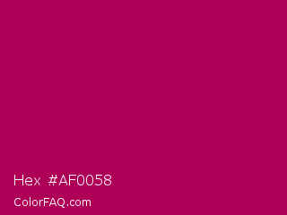 Hex #af0058 Color is a normal rose color and the nearest color is Lipstick #ab0563. Hex code #af0058 and RGB value is rgb(175,0,88). In RGB color space, this color is composed of 69% red, 0% green, 35% blue, In CMYK color space, this color is composed of 0% cyan, 100% magenta, 50% yellow , 31% black , In HSL color space, this color has a hue angle of 330° , 100% saturation and 34% lightness.