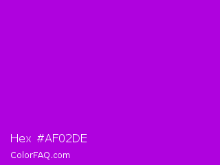Hex #af02de Color is a normal purple color and the nearest color is Vivid Mulberry #b80ce3. Hex code #af02de and RGB value is rgb(175,2,222). In RGB color space, this color is composed of 69% red, 1% green, 87% blue, In CMYK color space, this color is composed of 21% cyan, 99% magenta, 0% yellow , 13% black , In HSL color space, this color has a hue angle of 287° , 98% saturation and 44% lightness.