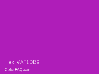 Hex #af1db9 Color is a normal magenta color and the nearest color is Heliotrope Magenta #aa00bb. Hex code #af1db9 and RGB value is rgb(175,29,185). In RGB color space, this color is composed of 69% red, 11% green, 73% blue, In CMYK color space, this color is composed of 5% cyan, 84% magenta, 0% yellow , 27% black , In HSL color space, this color has a hue angle of 296° , 73% saturation and 42% lightness.