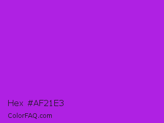 Hex #af21e3 Color is a normal purple color and the nearest color is Veronica #a020f0. Hex code #af21e3 and RGB value is rgb(175,33,227). In RGB color space, this color is composed of 69% red, 13% green, 89% blue, In CMYK color space, this color is composed of 23% cyan, 85% magenta, 0% yellow , 11% black , In HSL color space, this color has a hue angle of 284° , 78% saturation and 51% lightness.