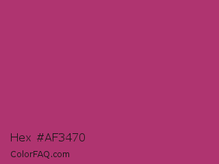 Hex #af3470 Color is a normal rose color and the nearest color is Royal Heath #ab3472. Hex code #af3470 and RGB value is rgb(175,52,112). In RGB color space, this color is composed of 69% red, 20% green, 44% blue, In CMYK color space, this color is composed of 0% cyan, 70% magenta, 36% yellow , 31% black , In HSL color space, this color has a hue angle of 331° , 54% saturation and 45% lightness.