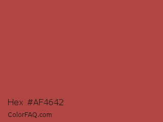 Hex #af4642 Color is a normal red color and the nearest color is Apple Blossom #af4d43. Hex code #af4642 and RGB value is rgb(175,70,66). In RGB color space, this color is composed of 69% red, 27% green, 26% blue, In CMYK color space, this color is composed of 0% cyan, 60% magenta, 62% yellow , 31% black , In HSL color space, this color has a hue angle of 2° , 45% saturation and 47% lightness.