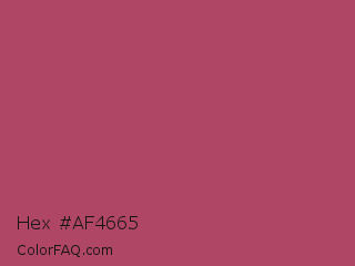Hex #af4665 Color is a normal rose color and the nearest color is Hippie Pink #ae4560. Hex code #af4665 and RGB value is rgb(175,70,101). In RGB color space, this color is composed of 69% red, 27% green, 40% blue, In CMYK color space, this color is composed of 0% cyan, 60% magenta, 42% yellow , 31% black , In HSL color space, this color has a hue angle of 342° , 43% saturation and 48% lightness.