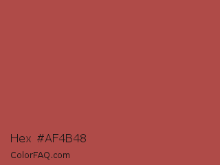 Hex #af4b48 Color is a normal red color and the nearest color is Apple Blossom #af4d43. Hex code #af4b48 and RGB value is rgb(175,75,72). In RGB color space, this color is composed of 69% red, 29% green, 28% blue, In CMYK color space, this color is composed of 0% cyan, 57% magenta, 59% yellow , 31% black , In HSL color space, this color has a hue angle of 2° , 42% saturation and 48% lightness.