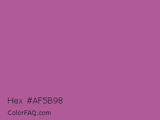 Hex #af5b98 Color is a normal magenta color and the nearest color is Pearly Purple #b768a2. Hex code #af5b98 and RGB value is rgb(175,91,152). In RGB color space, this color is composed of 69% red, 36% green, 60% blue, In CMYK color space, this color is composed of 0% cyan, 48% magenta, 13% yellow , 31% black , In HSL color space, this color has a hue angle of 316° , 34% saturation and 52% lightness.