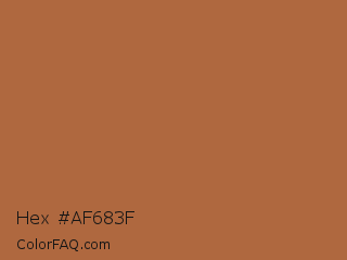 Hex #af683f Color is a normal orange color and the nearest color is Cape Palliser #a26645. Hex code #af683f and RGB value is rgb(175,104,63). In RGB color space, this color is composed of 69% red, 41% green, 25% blue, In CMYK color space, this color is composed of 0% cyan, 41% magenta, 64% yellow , 31% black , In HSL color space, this color has a hue angle of 22° , 47% saturation and 47% lightness.