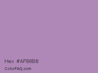 Hex #af88b8 Color is a light purple color and the nearest color is African Violet #b284be. Hex code #af88b8 and RGB value is rgb(175,136,184). In RGB color space, this color is composed of 69% red, 53% green, 72% blue, In CMYK color space, this color is composed of 5% cyan, 26% magenta, 0% yellow , 28% black , In HSL color space, this color has a hue angle of 289° , 25% saturation and 63% lightness.