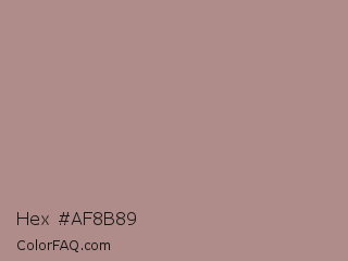 Hex #af8b89 Color is a light red color and the nearest color is Brandy Rose #bb8983. Hex code #af8b89 and RGB value is rgb(175,139,137). In RGB color space, this color is composed of 69% red, 55% green, 54% blue, In CMYK color space, this color is composed of 0% cyan, 21% magenta, 22% yellow , 31% black , In HSL color space, this color has a hue angle of 3° , 19% saturation and 61% lightness.