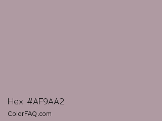 Hex #af9aa2 Color is a light rose color and the nearest color is Martini #afa09e. Hex code #af9aa2 and RGB value is rgb(175,154,162). In RGB color space, this color is composed of 69% red, 60% green, 64% blue, In CMYK color space, this color is composed of 0% cyan, 12% magenta, 7% yellow , 31% black , In HSL color space, this color has a hue angle of 337° , 12% saturation and 65% lightness.