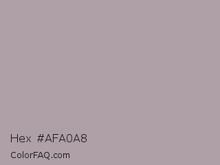 Hex #afa0a8 Color is a light rose color and the nearest color is Shady Lady #aaa5a9. Hex code #afa0a8 and RGB value is rgb(175,160,168). In RGB color space, this color is composed of 69% red, 63% green, 66% blue, In CMYK color space, this color is composed of 0% cyan, 9% magenta, 4% yellow , 31% black , In HSL color space, this color has a hue angle of 328° , 9% saturation and 66% lightness.