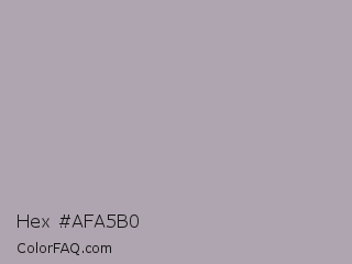 Hex #afa5b0 Color is a light magenta color and the nearest color is Shady Lady #aaa5a9. Hex code #afa5b0 and RGB value is rgb(175,165,176). In RGB color space, this color is composed of 69% red, 65% green, 69% blue, In CMYK color space, this color is composed of 1% cyan, 6% magenta, 0% yellow , 31% black , In HSL color space, this color has a hue angle of 295° , 7% saturation and 67% lightness.