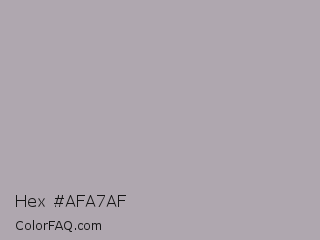 Hex #afa7af Color is a light magenta color and the nearest color is Silver Chalice #acacac. Hex code #afa7af and RGB value is rgb(175,167,175). In RGB color space, this color is composed of 69% red, 65% green, 69% blue, In CMYK color space, this color is composed of 0% cyan, 5% magenta, 0% yellow , 31% black , In HSL color space, this color has a hue angle of 300° , 5% saturation and 67% lightness.