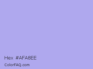 Hex #afa8ee Color is a light indigo color and the nearest color is Biloba Flower #b2a1ea. Hex code #afa8ee and RGB value is rgb(175,168,238). In RGB color space, this color is composed of 69% red, 66% green, 93% blue, In CMYK color space, this color is composed of 26% cyan, 29% magenta, 0% yellow , 7% black , In HSL color space, this color has a hue angle of 246° , 67% saturation and 80% lightness.