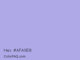 Hex #afa9e8 Color is a light indigo color and the nearest color is Maximum Blue Purple #acace6. Hex code #afa9e8 and RGB value is rgb(175,169,232). In RGB color space, this color is composed of 69% red, 66% green, 91% blue, In CMYK color space, this color is composed of 25% cyan, 27% magenta, 0% yellow , 9% black , In HSL color space, this color has a hue angle of 246° , 58% saturation and 79% lightness.