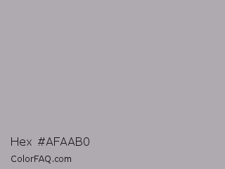 Hex #afaab0 Color is a light purple color and the nearest color is Silver Chalice #acacac. Hex code #afaab0 and RGB value is rgb(175,170,176). In RGB color space, this color is composed of 69% red, 67% green, 69% blue, In CMYK color space, this color is composed of 1% cyan, 3% magenta, 0% yellow , 31% black , In HSL color space, this color has a hue angle of 290° , 4% saturation and 68% lightness.
