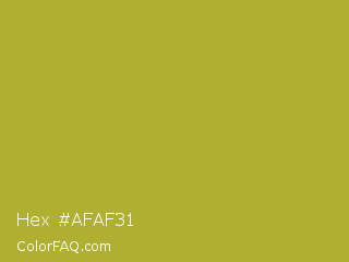 Hex #afaf31 Color is a normal yellow color and the nearest color is Brass #b5a642. Hex code #afaf31 and RGB value is rgb(175,175,49). In RGB color space, this color is composed of 69% red, 69% green, 19% blue, In CMYK color space, this color is composed of 0% cyan, 0% magenta, 72% yellow , 31% black , In HSL color space, this color has a hue angle of 60° , 56% saturation and 44% lightness.