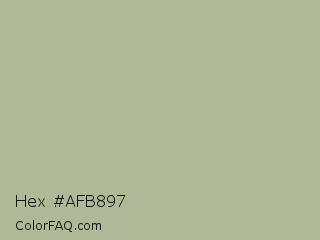 Hex #afb897 Color is a light lime color and the nearest color is Schist #a9b497. Hex code #afb897 and RGB value is rgb(175,184,151). In RGB color space, this color is composed of 69% red, 72% green, 59% blue, In CMYK color space, this color is composed of 5% cyan, 0% magenta, 18% yellow , 28% black , In HSL color space, this color has a hue angle of 76° , 19% saturation and 66% lightness.