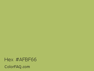 Hex #afbf66 Color is a normal lime color and the nearest color is Middle Green Yellow #acbf60. Hex code #afbf66 and RGB value is rgb(175,191,102). In RGB color space, this color is composed of 69% red, 75% green, 40% blue, In CMYK color space, this color is composed of 8% cyan, 0% magenta, 47% yellow , 25% black , In HSL color space, this color has a hue angle of 71° , 41% saturation and 57% lightness.