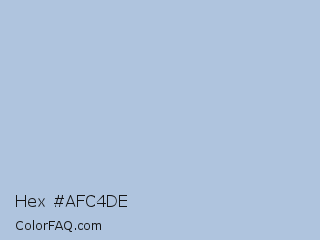 Hex #afc4de Color is a light blue color and the nearest color is Light Steel Blue #b0c4de. Hex code #afc4de and RGB value is rgb(175,196,222). In RGB color space, this color is composed of 69% red, 77% green, 87% blue, In CMYK color space, this color is composed of 21% cyan, 12% magenta, 0% yellow , 13% black , In HSL color space, this color has a hue angle of 213° , 42% saturation and 78% lightness.