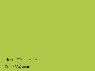 Hex #afc848 Color is a normal lime color and the nearest color is Android Green #a4c639. Hex code #afc848 and RGB value is rgb(175,200,72). In RGB color space, this color is composed of 69% red, 78% green, 28% blue, In CMYK color space, this color is composed of 13% cyan, 0% magenta, 64% yellow , 22% black , In HSL color space, this color has a hue angle of 72° , 54% saturation and 53% lightness.