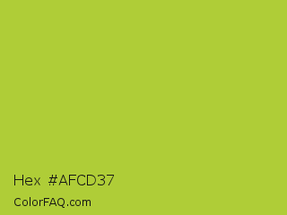 Hex #afcd37 Color is a normal lime color and the nearest color is Android Green #a4c639. Hex code #afcd37 and RGB value is rgb(175,205,55). In RGB color space, this color is composed of 69% red, 80% green, 22% blue, In CMYK color space, this color is composed of 15% cyan, 0% magenta, 73% yellow , 20% black , In HSL color space, this color has a hue angle of 72° , 60% saturation and 51% lightness.