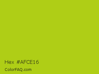 Hex #afce16 Color is a normal yellow color and the nearest color is Bahia #a5cb0c. Hex code #afce16 and RGB value is rgb(175,206,22). In RGB color space, this color is composed of 69% red, 81% green, 9% blue, In CMYK color space, this color is composed of 15% cyan, 0% magenta, 89% yellow , 19% black , In HSL color space, this color has a hue angle of 70° , 81% saturation and 45% lightness.