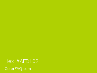 Hex #afd102 Color is a normal yellow color and the nearest color is Vivid Lime Green #a6d608. Hex code #afd102 and RGB value is rgb(175,209,2). In RGB color space, this color is composed of 69% red, 82% green, 1% blue, In CMYK color space, this color is composed of 16% cyan, 0% magenta, 99% yellow , 18% black , In HSL color space, this color has a hue angle of 70° , 98% saturation and 41% lightness.