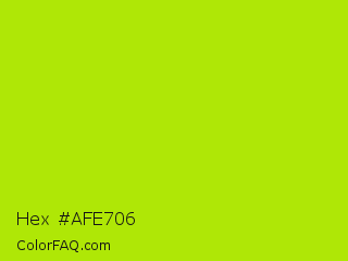 Hex #afe706 Color is a normal lime color and the nearest color is Inch Worm #b0e313. Hex code #afe706 and RGB value is rgb(175,231,6). In RGB color space, this color is composed of 69% red, 91% green, 2% blue, In CMYK color space, this color is composed of 24% cyan, 0% magenta, 97% yellow , 9% black , In HSL color space, this color has a hue angle of 75° , 95% saturation and 46% lightness.