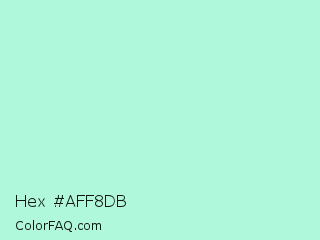 Hex #aff8db Color is a very light green color and the nearest color is Ice Cold #b1f4e7. Hex code #aff8db and RGB value is rgb(175,248,219). In RGB color space, this color is composed of 69% red, 97% green, 86% blue, In CMYK color space, this color is composed of 29% cyan, 0% magenta, 12% yellow , 3% black , In HSL color space, this color has a hue angle of 156° , 84% saturation and 83% lightness.