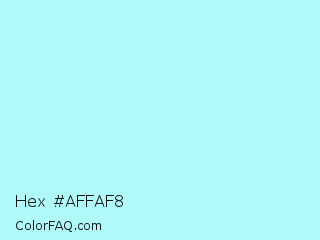 Hex #affaf8 Color is a very light cyan color and the nearest color is Italian Sky Blue #b2ffff. Hex code #affaf8 and RGB value is rgb(175,250,248). In RGB color space, this color is composed of 69% red, 98% green, 97% blue, In CMYK color space, this color is composed of 30% cyan, 0% magenta, 1% yellow , 2% black , In HSL color space, this color has a hue angle of 178° , 88% saturation and 83% lightness.