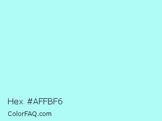 Hex #affbf6 Color is a very light cyan color and the nearest color is Italian Sky Blue #b2ffff. Hex code #affbf6 and RGB value is rgb(175,251,246). In RGB color space, this color is composed of 69% red, 98% green, 96% blue, In CMYK color space, this color is composed of 30% cyan, 0% magenta, 2% yellow , 2% black , In HSL color space, this color has a hue angle of 176° , 90% saturation and 84% lightness.