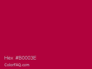 Hex #b0003e Color is a normal rose color and the nearest color is Shiraz #b20931. Hex code #b0003e and RGB value is rgb(176,0,62). In RGB color space, this color is composed of 69% red, 0% green, 24% blue, In CMYK color space, this color is composed of 0% cyan, 100% magenta, 65% yellow , 31% black , In HSL color space, this color has a hue angle of 339° , 100% saturation and 35% lightness.
