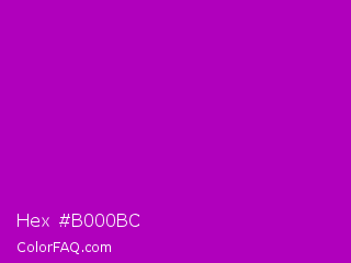 Hex #b000bc Color is a normal magenta color and the nearest color is Heliotrope Magenta #aa00bb. Hex code #b000bc and RGB value is rgb(176,0,188). In RGB color space, this color is composed of 69% red, 0% green, 74% blue, In CMYK color space, this color is composed of 6% cyan, 100% magenta, 0% yellow , 26% black , In HSL color space, this color has a hue angle of 296° , 100% saturation and 37% lightness.
