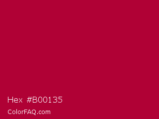 Hex #b00135 Color is a normal rose color and the nearest color is Shiraz #b20931. Hex code #b00135 and RGB value is rgb(176,1,53). In RGB color space, this color is composed of 69% red, 0% green, 21% blue, In CMYK color space, this color is composed of 0% cyan, 99% magenta, 70% yellow , 31% black , In HSL color space, this color has a hue angle of 342° , 99% saturation and 35% lightness.
