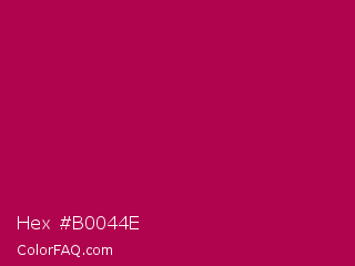 Hex #b0044e Color is a normal rose color and the nearest color is Pictorial Carmine #c30b4e. Hex code #b0044e and RGB value is rgb(176,4,78). In RGB color space, this color is composed of 69% red, 2% green, 31% blue, In CMYK color space, this color is composed of 0% cyan, 98% magenta, 56% yellow , 31% black , In HSL color space, this color has a hue angle of 334° , 96% saturation and 35% lightness.