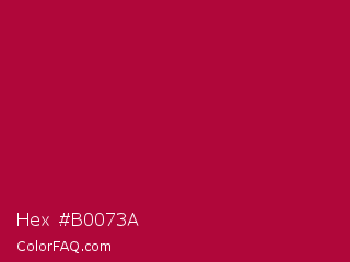 Hex #b0073a Color is a normal rose color and the nearest color is Shiraz #b20931. Hex code #b0073a and RGB value is rgb(176,7,58). In RGB color space, this color is composed of 69% red, 3% green, 23% blue, In CMYK color space, this color is composed of 0% cyan, 96% magenta, 67% yellow , 31% black , In HSL color space, this color has a hue angle of 342° , 92% saturation and 36% lightness.