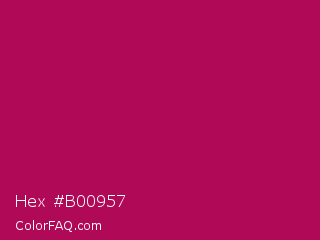 Hex #b00957 Color is a normal rose color and the nearest color is Jazzberry Jam #a50b5e. Hex code #b00957 and RGB value is rgb(176,9,87). In RGB color space, this color is composed of 69% red, 4% green, 34% blue, In CMYK color space, this color is composed of 0% cyan, 95% magenta, 51% yellow , 31% black , In HSL color space, this color has a hue angle of 332° , 90% saturation and 36% lightness.