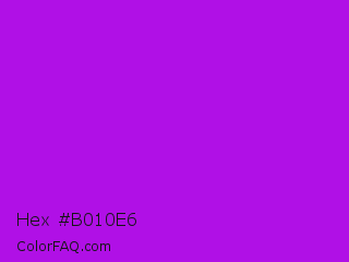 Hex #b010e6 Color is a normal purple color and the nearest color is Vivid Mulberry #b80ce3. Hex code #b010e6 and RGB value is rgb(176,16,230). In RGB color space, this color is composed of 69% red, 6% green, 90% blue, In CMYK color space, this color is composed of 23% cyan, 93% magenta, 0% yellow , 10% black , In HSL color space, this color has a hue angle of 285° , 87% saturation and 48% lightness.