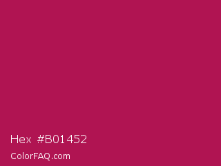 Hex #b01452 Color is a normal rose color and the nearest color is French Wine #ac1e44. Hex code #b01452 and RGB value is rgb(176,20,82). In RGB color space, this color is composed of 69% red, 8% green, 32% blue, In CMYK color space, this color is composed of 0% cyan, 89% magenta, 53% yellow , 31% black , In HSL color space, this color has a hue angle of 336° , 80% saturation and 38% lightness.