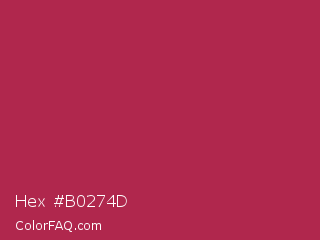 Hex #b0274d Color is a normal rose color and the nearest color is Amaranth Purple #ab274f. Hex code #b0274d and RGB value is rgb(176,39,77). In RGB color space, this color is composed of 69% red, 15% green, 30% blue, In CMYK color space, this color is composed of 0% cyan, 78% magenta, 56% yellow , 31% black , In HSL color space, this color has a hue angle of 343° , 64% saturation and 42% lightness.
