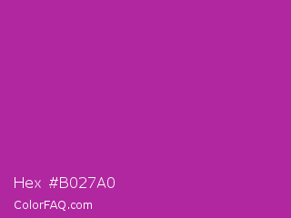 Hex #b027a0 Color is a normal magenta color and the nearest color is Byzantine #bd33a4. Hex code #b027a0 and RGB value is rgb(176,39,160). In RGB color space, this color is composed of 69% red, 15% green, 63% blue, In CMYK color space, this color is composed of 0% cyan, 78% magenta, 9% yellow , 31% black , In HSL color space, this color has a hue angle of 307° , 64% saturation and 42% lightness.