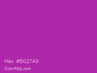 Hex #b027a9 Color is a normal magenta color and the nearest color is Byzantine #bd33a4. Hex code #b027a9 and RGB value is rgb(176,39,169). In RGB color space, this color is composed of 69% red, 15% green, 66% blue, In CMYK color space, this color is composed of 0% cyan, 78% magenta, 4% yellow , 31% black , In HSL color space, this color has a hue angle of 303° , 64% saturation and 42% lightness.