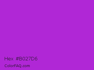 Hex #b027d6 Color is a normal purple color and the nearest color is Dark Orchid #9932cc. Hex code #b027d6 and RGB value is rgb(176,39,214). In RGB color space, this color is composed of 69% red, 15% green, 84% blue, In CMYK color space, this color is composed of 18% cyan, 82% magenta, 0% yellow , 16% black , In HSL color space, this color has a hue angle of 287° , 69% saturation and 50% lightness.