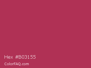 Hex #b03155 Color is a normal rose color and the nearest color is Night Shadz #aa375a. Hex code #b03155 and RGB value is rgb(176,49,85). In RGB color space, this color is composed of 69% red, 19% green, 33% blue, In CMYK color space, this color is composed of 0% cyan, 72% magenta, 52% yellow , 31% black , In HSL color space, this color has a hue angle of 343° , 56% saturation and 44% lightness.