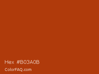 Hex #b03a0b Color is a normal orange color and the nearest color is Rust #b7410e. Hex code #b03a0b and RGB value is rgb(176,58,11). In RGB color space, this color is composed of 69% red, 23% green, 4% blue, In CMYK color space, this color is composed of 0% cyan, 67% magenta, 94% yellow , 31% black , In HSL color space, this color has a hue angle of 17° , 88% saturation and 37% lightness.