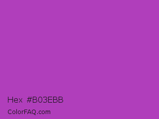 Hex #b03ebb Color is a normal magenta color and the nearest color is Purple Plum #9c51b6. Hex code #b03ebb and RGB value is rgb(176,62,187). In RGB color space, this color is composed of 69% red, 24% green, 73% blue, In CMYK color space, this color is composed of 6% cyan, 67% magenta, 0% yellow , 27% black , In HSL color space, this color has a hue angle of 295° , 50% saturation and 49% lightness.