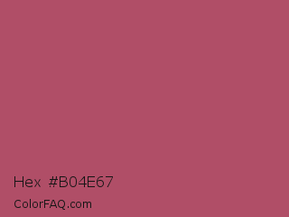 Hex #b04e67 Color is a normal red color and the nearest color is Cadillac #b04c6a. Hex code #b04e67 and RGB value is rgb(176,78,103). In RGB color space, this color is composed of 69% red, 31% green, 40% blue, In CMYK color space, this color is composed of 0% cyan, 56% magenta, 41% yellow , 31% black , In HSL color space, this color has a hue angle of 345° , 39% saturation and 50% lightness.