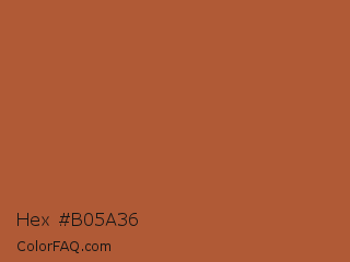 Hex #b05a36 Color is a normal orange color and the nearest color is Brown Rust #af593e. Hex code #b05a36 and RGB value is rgb(176,90,54). In RGB color space, this color is composed of 69% red, 35% green, 21% blue, In CMYK color space, this color is composed of 0% cyan, 49% magenta, 69% yellow , 31% black , In HSL color space, this color has a hue angle of 18° , 53% saturation and 45% lightness.