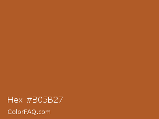 Hex #b05b27 Color is a normal orange color and the nearest color is Desert #ae6020. Hex code #b05b27 and RGB value is rgb(176,91,39). In RGB color space, this color is composed of 69% red, 36% green, 15% blue, In CMYK color space, this color is composed of 0% cyan, 48% magenta, 78% yellow , 31% black , In HSL color space, this color has a hue angle of 23° , 64% saturation and 42% lightness.
